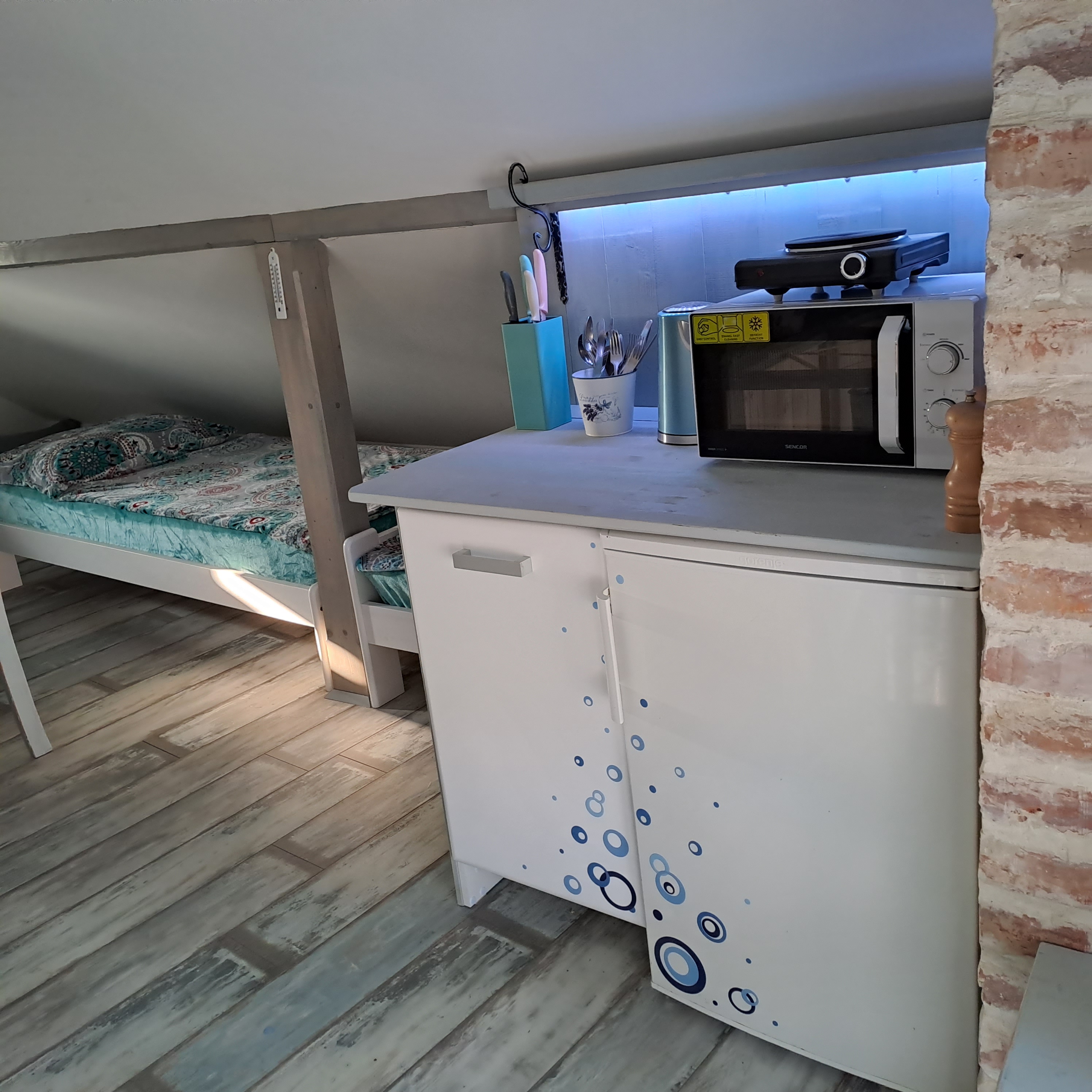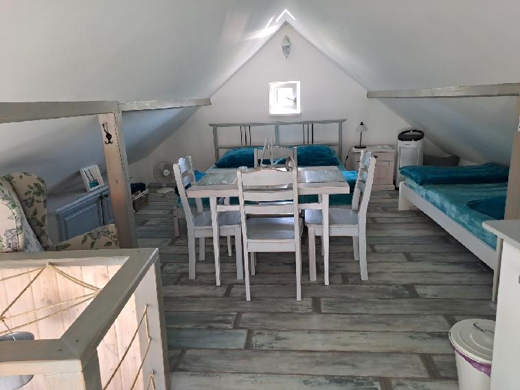 V apartmánu je vybavená malá kuchyňská linka s ledničkou, vařičem, mikrovlnkou, várnou konvicí a kompletním kuchyňským nádobím, bez dřezu. Možnost využít i velkou kuchyni v přízemí.